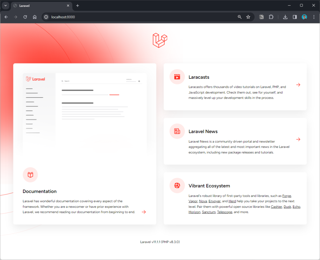 php artisan servePerintah tersebut digunakan untuk menjalankan server local Laravel. Jika berhasil, proyek kita akan berjalan di localhost dengan port 8000. Kalian dapat membukanya di browser dengan mengetikkan http://localhost:8000. Jika berhasil, akan ditampilkan hasil seperti berikut ini.