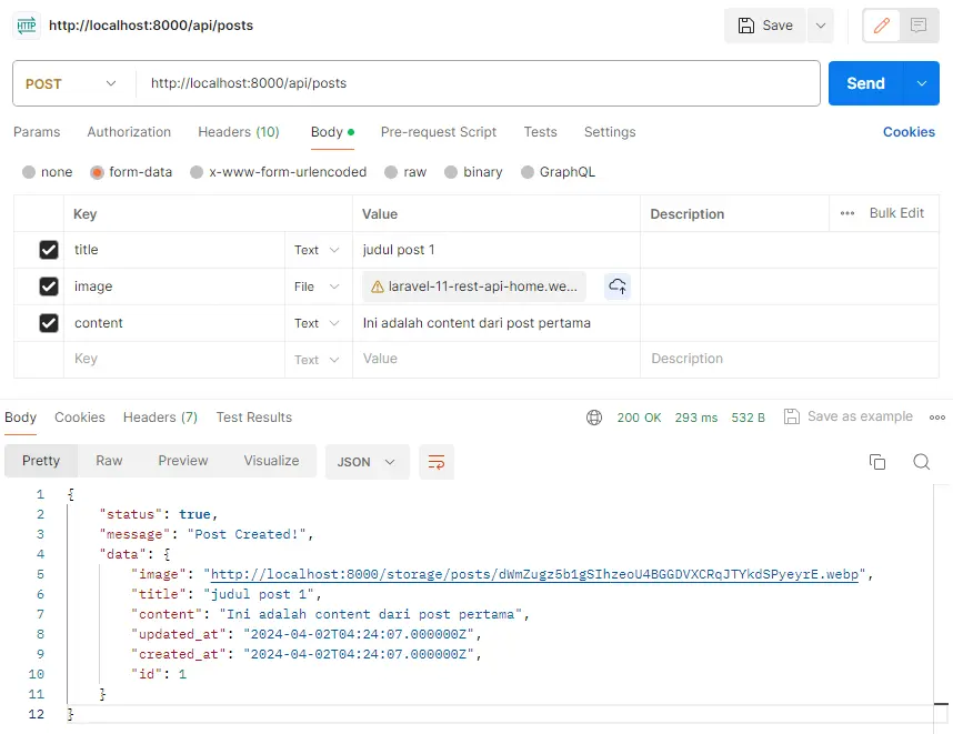 Sebagai contoh kita akan mengupdate Post dengan ID = 2. Maka ubah URL nya menjadi: http://localhost:8000/api/posts/2. Pilih Method menjadi POST, dan pada tab body isikan form-data sebagai berikut dan klik Send.
