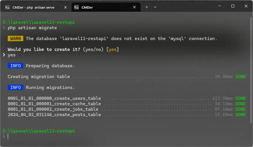 php artisan migrateJika muncul pertanyaan seperti ini, maka silahkan pilih Yes dan tekan Enter.