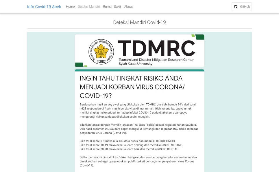 Aplikasi Info Covid-19 Aceh merupakan aplikasi yang memberikan data seputar total penderita Covid-19 di Provinsi Aceh. Semua data pada aplikasi ini didapatkan dari situs: https://covid19.acehprov.go.id/. Pada aplikasi ini juga bisa melakukan Deteksi Mandiri Covid-19. Form untuk melakukan Deteksi Mandiri di dapat dari situs: TDMRC - Unsyiah.